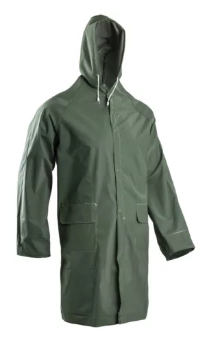 * poliészter/pamut alapra kétszer mártott PVC* 0,32 mm vastag, varrott és hegesztett, vízálló* két külső zseb, gumírozott mandzsetta* rövid, 3/4-es (100 cm) köpeny kivitel