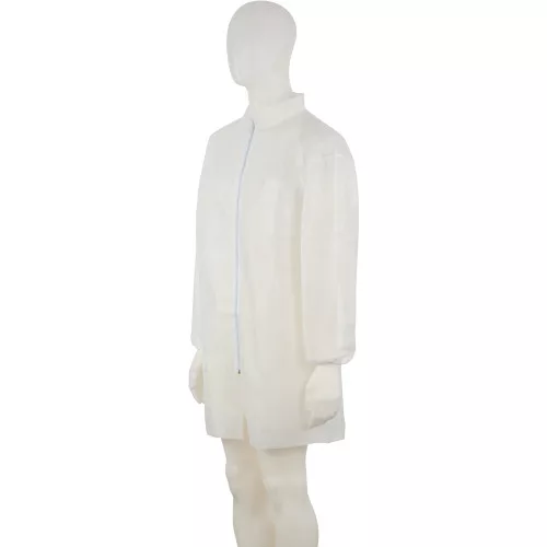 • látogatóköpeny könnyű és jól szellőző polipropilén anyagból, ideális higiéniai alkalmazásokhoz • antisztatikusan kezelt • elülső cipzár • rugalmas mandzsetta • galléros kivitel (laborköpenyekhez) • CE 1. Kategória