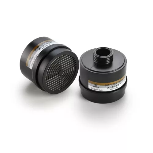 * A2B2P3 kombinált szűrőbetét GAN21000 PANAREA teljesálachoz és GAN21005 EURMASK félálarchoz * A:65 °C-nál magasabb forrpontú oldószerek, szerves gázok, gőzök ellen; B:szervetlen gázok, gőzök ellen (kivéve CO); P3:erős méreg kategóriájú, szilárd és folyékony részecskék ellen* DIN menetes