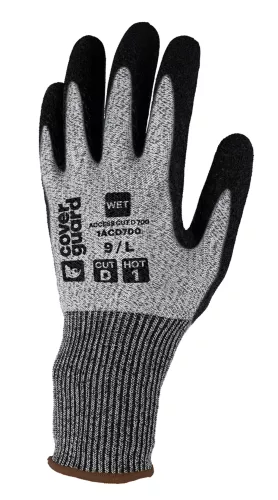 13-as kötésű, szürke, varrás nélküli alapanyag HPPE-ből, acélszálból, spandexből és poliészterbőlFekete, krepp latex tenyérmártásKötött mandzsetta