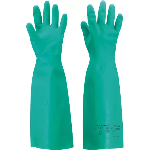 • 0,56 mm vastag nitrilből készült zöld antisztatikus kesztyű textúrált tenyér- és ujjfelülettel. Teljes hossza: 45,5 cm.