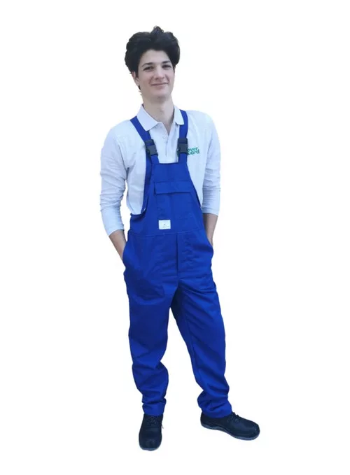 * királykék 350 g/m2-es, lángmentesített, 99% pamut alapanyag + 1% beleszőtt, minősített antisztatikus szállal * biztonsági varratok kettős lánc-, plusz 3 fonalas szegőöltéssel* mindenhol fedett hőálló teflon gombok, a zsebeken tépőzáras zsebfedők, vagy a zsebek nyílása függőleges irányú, így megakadályozzák a szikrák és forró fémcseppek bejutását* állítható, gumibetétes vállpánt, magasított oldal, gumírozott hátrész, két függőleges nyílású biztonsági foltzseb és a mellrészen egy tépőzáras zsebfedővel rendelkező biztonsági zseb