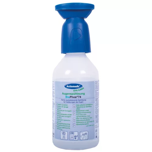 Steril szemkimosó palack 4,9%-os foszfát-puffer oldattal, vegyszerek (savak és lúgok) okozta szemsérülések esetén, nagy pufferkapacitású, különösen kíméletes a mesterséges összetevők és tartósítószerek hiánya miatt. Ergonomikus öblítőfejjel és porvédővel. Megfelel a DIN EN 15 154-4 szabványnak. Mobil használatra vagy állomások és tartók feltöltésére is. Öblítési idő: kb. 2.5 perc. Eltarthatóság: 3 év.