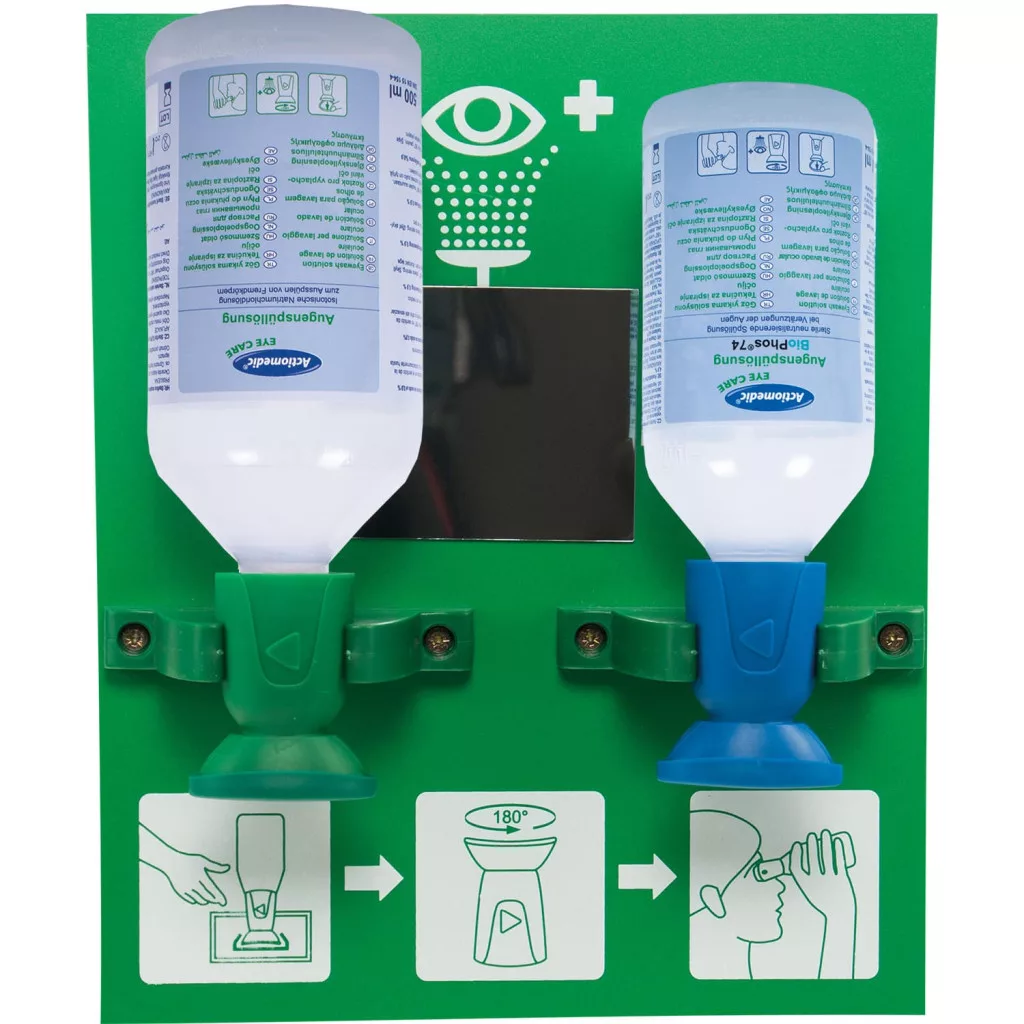 Szemkimosó állomás két palackkal, fali tartóval. Használatra kész, steril palackok, ergonomikus öblítőfejjel és porvédő kupakkal. Piktogramos használati utasítás táblával és tükörrel a könnyű kezelhetőség érdekében. Rögzítéshez szükséges csavarokkal + sürgősségi szembaleseti tervvel. 1 x 500 ml 0.9% nátrium-klorid oldattal + 1 x 250 ml BioPhos®74 foszfát-puffer oldattal. Öblítési idő: nátrium-klorid oldat kb. 5 perc, BioPhos®74 kb. 2.5 perc. Eltarthatóság: 3 év.