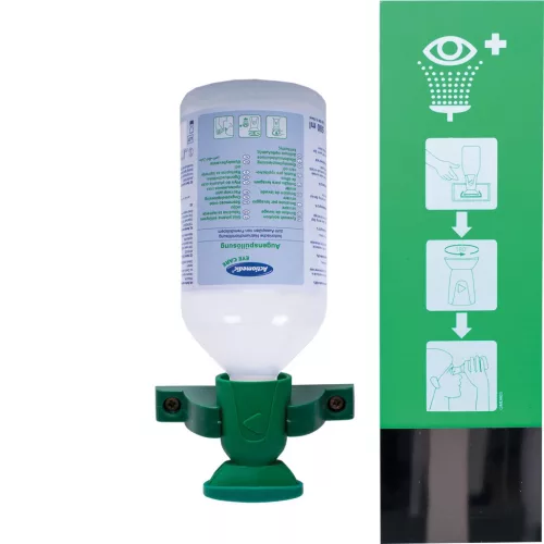 Szemkimosó állomás egy palackkal, fali tartóval. Használatra kész, steril palack, ergonomikus öblítőfejjel és porvédő kupakkal. Piktogramos használati utasítás táblával és tükörrel a könnyű kezelhetőség érdekében. Rögzítéshez szükséges csavarokkal + sürgősségi szembaleseti tervvel. 1 x 500 ml nátrium-klorid oldattal. Öblítési idő: kb. 5 perc. Eltarthatóság: 3 év.