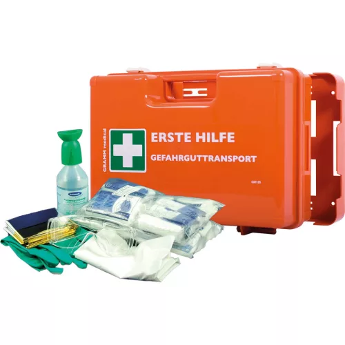 Elsősegély-felszerelés veszélyes áruk szállításához DIN 13 164 szerinti tartalommal és kiegészítő termékekkel