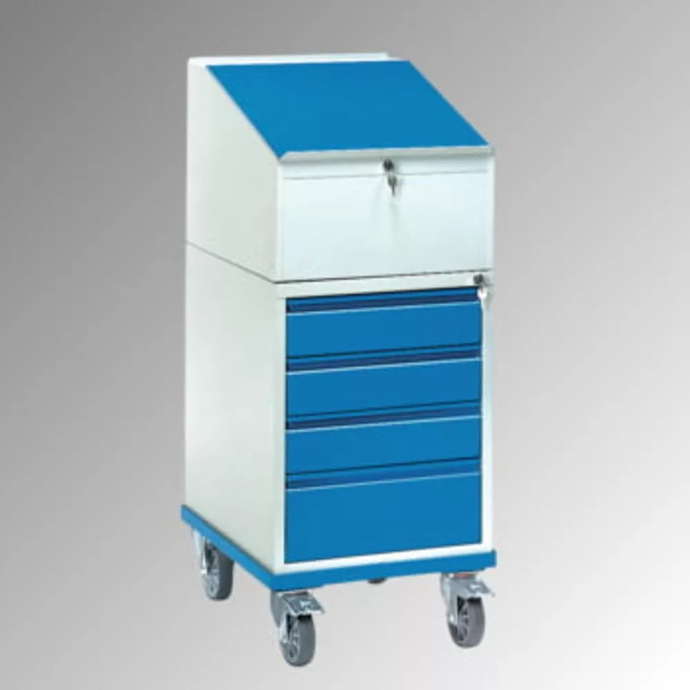 Álló íróasztal, íróasztallal, 4 fiókos szekrény 3x120, 1x180 mm, széxméxma 550x650x1034/1197 mm, ral 7035/5007