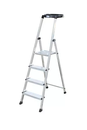 Praktikus és sokoldalú lépcsőfokos állólétra szinte korlátlan tárolási lehetőséggel, vödörtartóval és csúszásmentes dobogóval.