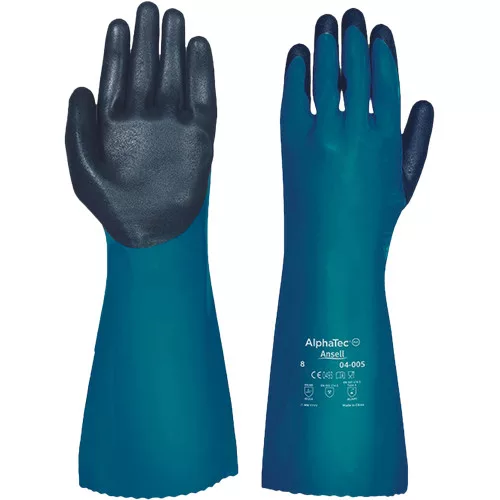 • robust, long-cuffed PVC gloves, offering grip, comfort and chemical resistance • heightened protection: With their special PVC and nitrile formulation, AlphaTec 04-005 protective gloves blend high-level chemical resistance*, abrasion protection and sustained flexibility, even at low temperatures • food handling compliance: These latex-free industrial gloves also satisfy FDA and EU food processing and hygiene norms, resulting in ideal • food safety gloves for a variety of applications Increased comfort: Thanks to their 13-gauge seamless cotton design, they offer an excellent • balance between personal protection and user comfort • Enhanced features: These AlphaTec gloves’ foam grip design guards against oil and grease, while maintaining superb grip in wet and oily environments, and their 38cm/15" glove length further enhances wearer protection • advanced ergonomics: In addition, their ergonomic hand shape further enhances wearer comfort and makes them easy to use over a prolonged period
