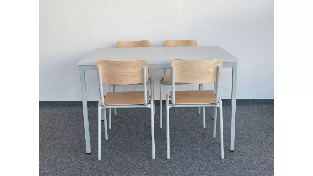 Asztal és szék szett, 4 rakásolható székből és 1 db 1200 mm széles asztalból, világosszürke váz, bükk ülés/háttámla, világosszürke asztallap