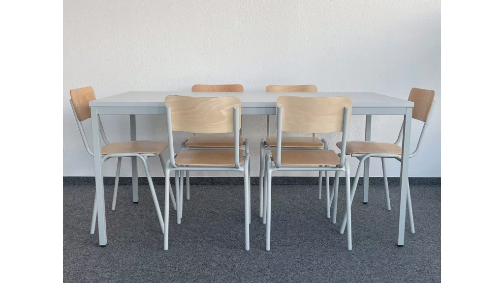 Asztal és szék szett, 6 rakásolható székből és 1 db 1600 mm széles asztalból áll, világosszürke váz, bükk ülés/háttámla, világosszürke asztallap