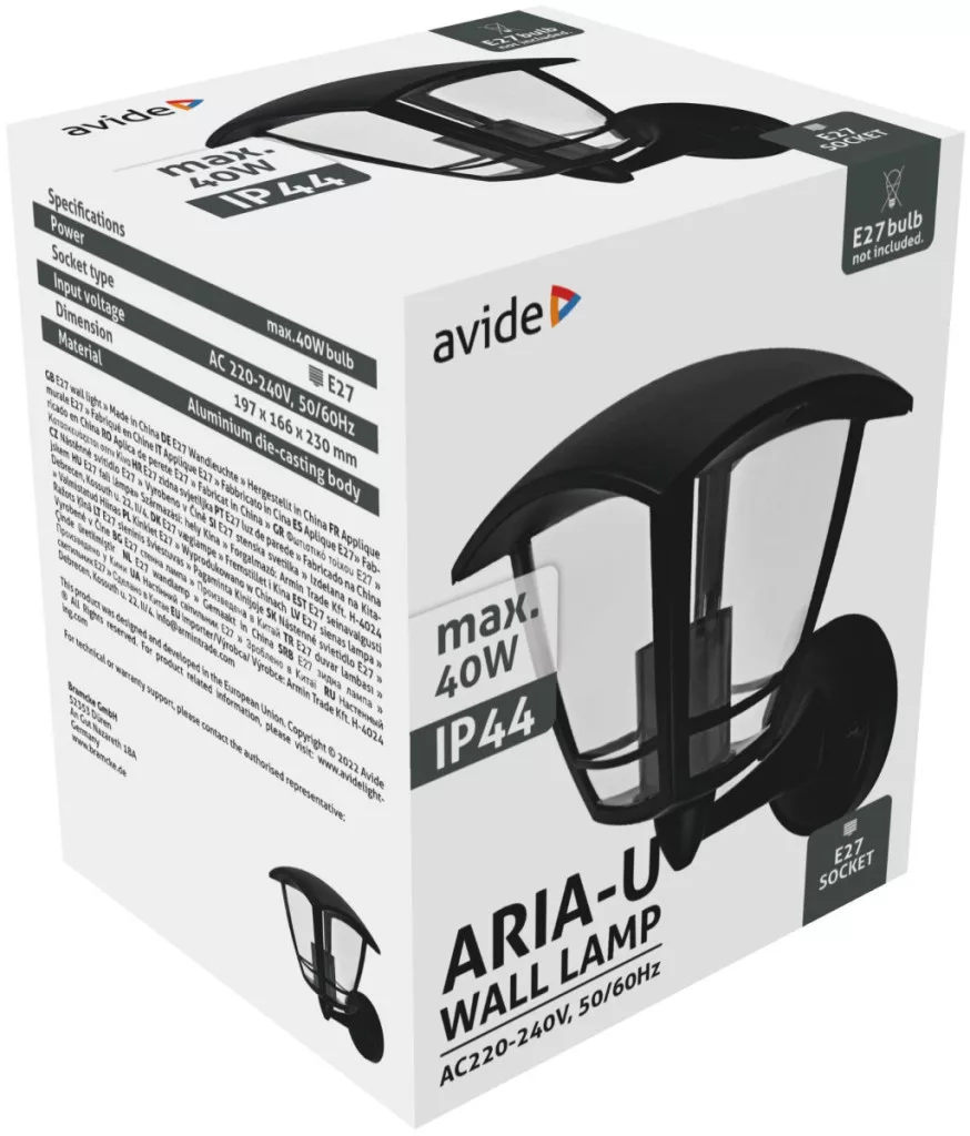 Avide Kültéri Fali Lámpa Aria-U 1xE27 Fekete IP44
