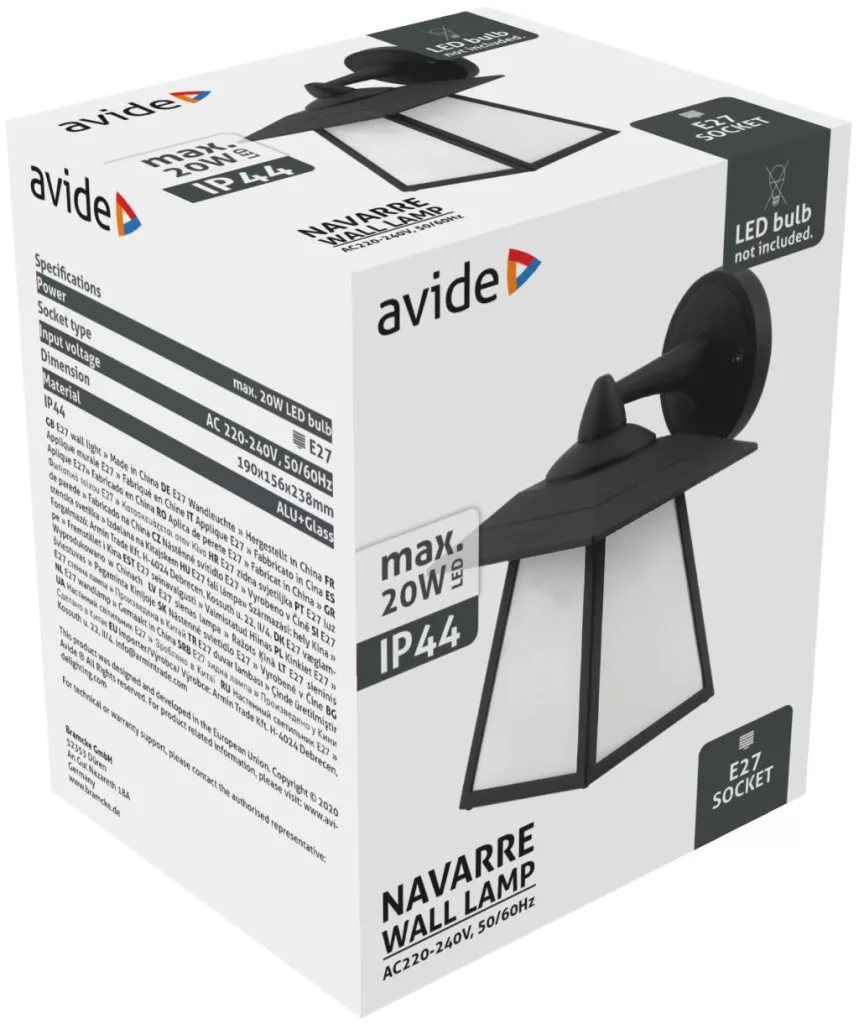 Avide kültéri fali lámpa felületre szerelhető fém üveg házas lámpatest E 27 foglalattal, IP44 védelemmel mely alkalmassá teszi kültéri használatra.