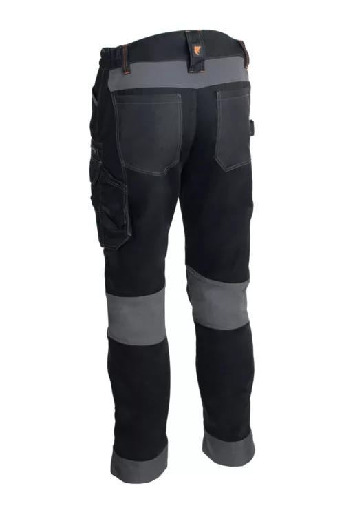 * Twill szövésű, 270 g/m2 vastag, 60% pamut és 40% poliészter kevertszálas alapanyag * 260 g/m2 vastag sztreccs és 600D Oxford alapanyag * gombbal és cipzárral záródó, gumírozott derék* száron még 5 cm-es lehajtási lehetőség * hosszított derékrész és lábköz sztreccs betéttel * 8 zseb, 2 szerszámtartó hurok * térdvédő zsebek * biztonsági tripla varrás * regular fit