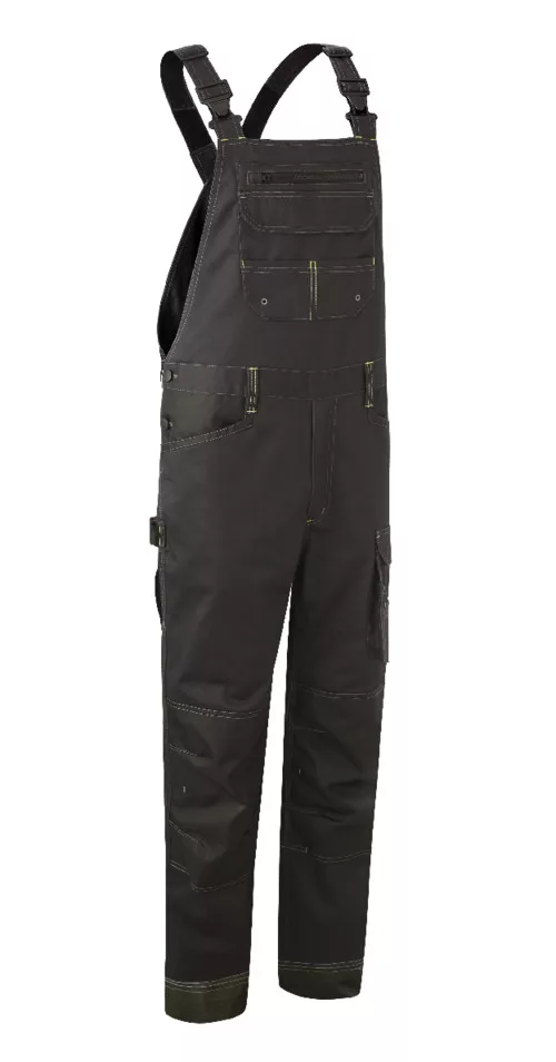 270 g/m2 vastag, 60% pamut + 40% poliészter kevertszálas antracit színű alapanyag, kopásálló Oxford 100% PES betétekkel,kopásálló Oxford térdfolt bőségránccal és tépőzáras térdeplőtasak, rendelhető térdvédővel (8KNEE), állítható műanyag csatos vállpánt, övbújtatók és oldalgombos gumírozott derék,egy cipzáras és egy fedett mellzseb, két bebújós oldalzseb, két farzseb, egy többrekeszes fedett cargo zseb kalapácstartó hurokkal és egy háromrészes szerszámtartó