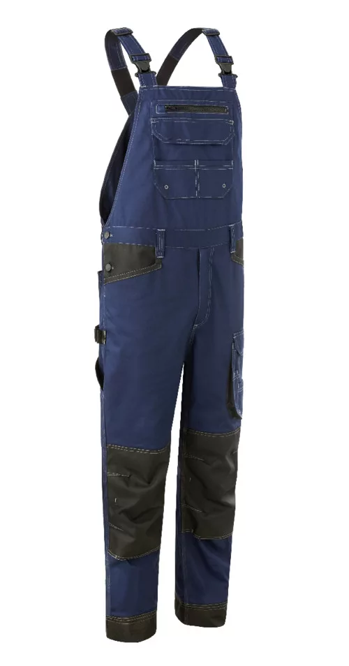 270 g/m2 vastag, 60% pamut + 40% poliészter kevertszálas sötétkék színű alapanyag, kopásálló Oxford 100% PES betétekkel,kopásálló Oxford térdfolt bőségránccal és tépőzáras térdeplőtasak, rendelhető térdvédővel (8KNEE), állítható műanyag csatos vállpánt, övbújtatók és oldalgombos gumírozott derék, egy cipzáras és egy fedett mellzseb, két bebújós oldalzseb, két farzseb, egy többrekeszes fedett cargo zseb kalapácstartó hurokkal és egy háromrészes szerszámtartó