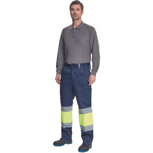 • férfi munkanadrág 7 cm széles fényvisszavető csíkokkal és Hi-Vis elemekkel • 2 első zseb + 1 érmezseb • 2 oldalzseb • 2 hátsó zseb • rugalmas oldalsó betétek a derékpánton • leengedhető szárak