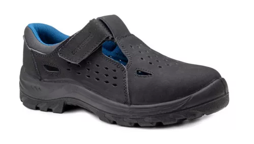 * biztonsági tépőzáras kivitelű védőszandál puha, jól szellőző nubuk bőr felsőrészszel lábujjvédő nélkül * antisztatikus, olaj- és saválló, hajlékony kétrétegű PU talp ,nedves kerámia és acél felületre bevizsgált SRC csúszásmentesség * szélesebb orr, rüszt és lábközép * szivaccsal párnázott boka , ütődéselnyelő sarok, kényelmes talpbetét, kék színű komfortos nemszőtt belső bélés