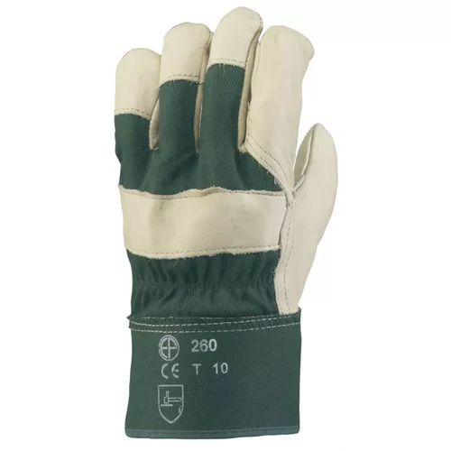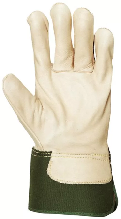 Rakodó kesztyű színmarhabőrből, 1,2mm vastagságú.Pamut béléssel, zöld vászonnal a mandzsettán és a kézháton, 8cm-es biztonsági mandzsettával