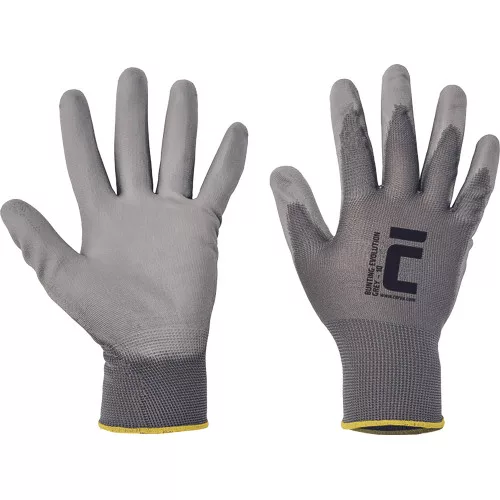 • kötött PES védőkesztyű • tenyéren vékony rétegű PU mártással • rugalmas mandzsetta