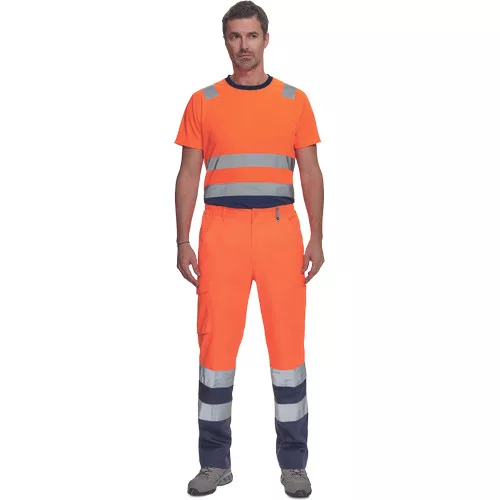 • férfi Hi-Vis munkanadrág 7 cm széles fényvisszavető csíkokkal • 2 első zseb + 1 érmezseb • 2 oldalzseb • 2 hátsó zseb • rugalmas oldalsó betétek a derékpánton • leengedhető szárak