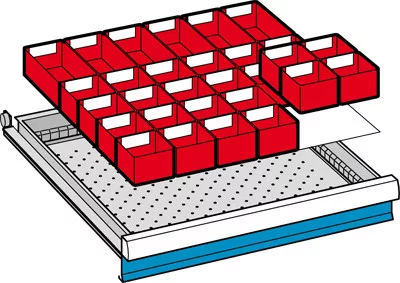 Betétdobozok, elülső magasság 100 mm, 18 doboz 150x75 mm, fiókméret szé x mé 459x459 mm