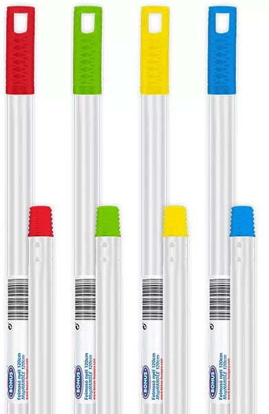 A fehér színű műanyag bevonattal ellátott alumínium nyelet négyszínű – piros, sárga, zöld és kék – csavaros véggel láttuk el, így kedvenc felmosóvödrünkhöz illő színt választhatunk. Ez a könnyen kezelhető alapdarab igazán tartós, és emellett kellemes élménnyé teszi a felmosást.