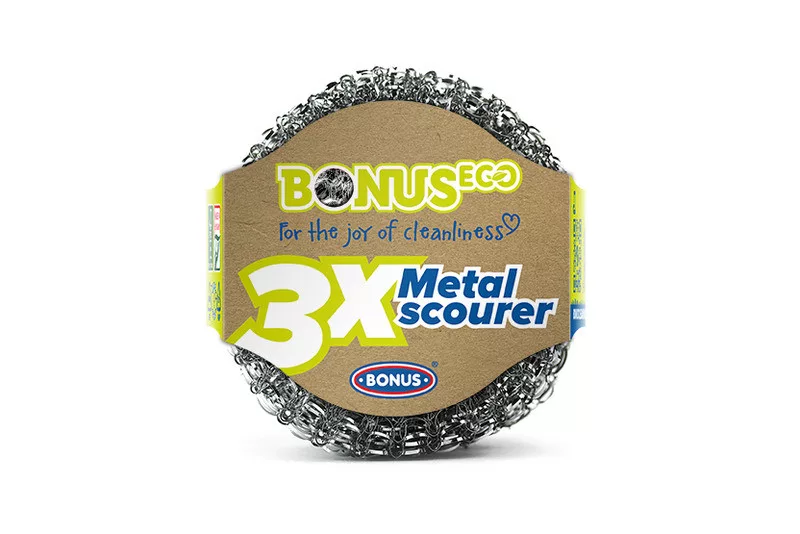A fémgombolyag hatékonyságának titka az elektrogalvanizált acél, amelyet a milliméter tört részére kilapítva használunk fel. A lapítást követően az acélszálakból erős fémhálót készítünk, amelyet kényelmes tenyérméretűre formázunk. Ez az izgalmas és innovatív eljárás garantálja, hogy a BONUS fém dörzsi igazán tartós és erős legyen. Az ergonomikus kialakításnak köszönhetően szépen simul a tenyérbe és biztos fogást nyújt, ráadásul a nehezen elérhető helyeket is tisztán tarthatjuk vele.