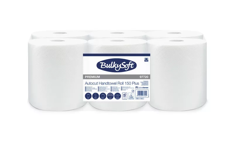 BulkySoft Advanced System laponkénti adagolású kéztörlő (NVA), 18 cm, 2 rétegű, hófehér, 150 méter/tekercs, 100% cellulóz, 6 tekercs/zsák
