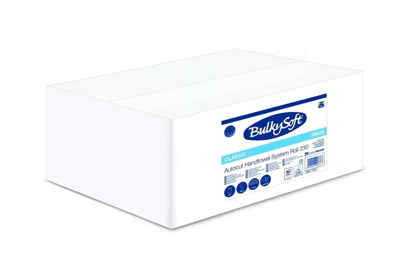 BulkySoft Classic Autocut laponkénti adagolású kéztörlő, 19,5 cm, 2 rétegű, hófehér, 230 méter/tekercs, 100% cellulóz, 6 tekercs/doboz