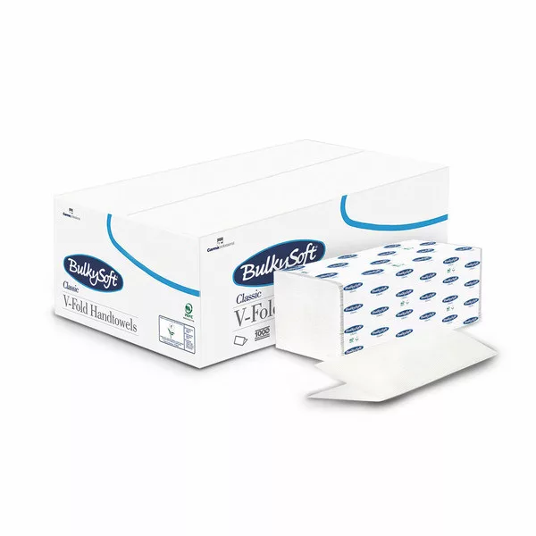 BulkySoft Classic V ''150'' hajtogatott kéztörlő, 2 rétegű, hófehér, 24x21 cm, 150 lap, 100% cellulóz, 20 csomag/karton