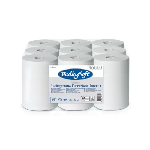 BulkySoft Excellence Centrefeed belsőmagos tekercses kéztörlő, 13 cm, 2 rétegű, fehér, 200 lap, 60 méter/tekercs, 9 tekercs/zsák