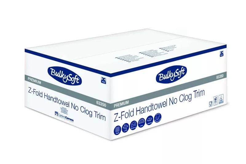 BulkySoft Premium Z ''No Clog'' extra gyorsan oldódó hajtogatott kéztörlő, 2 rétegű, hófehér, 20,5x24 cm, 150 lap, 100% cellulóz, 25 csomag/karton