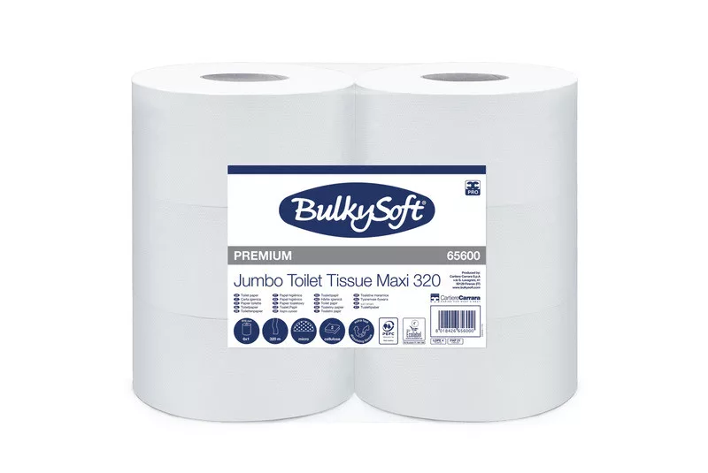 BulkySoft Premium maxi Jumbo extra gyorsan oldódó toalettpapír (wc papír), 25,5cm, 2 rétegű, hófehér, 320 méter/tekercs, 6 tekercs/zsák