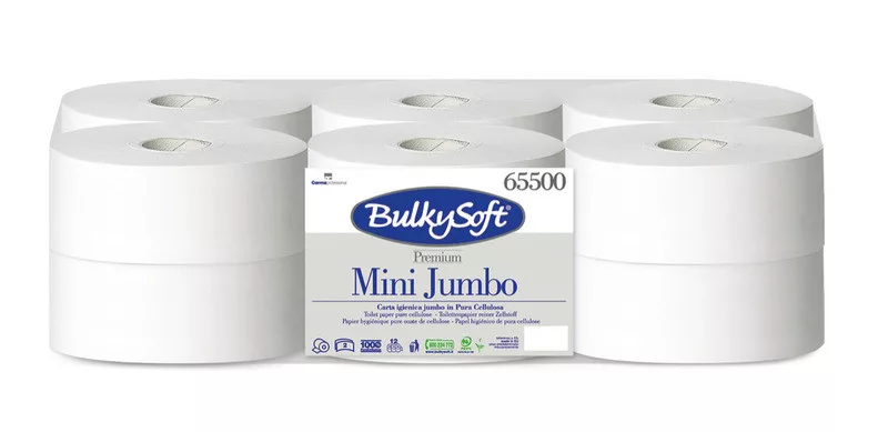 BulkySoft Premium mini Jumbo extra gyorsan oldódó toalettpapír (wc papír), 19cm, 2 rétegű, hófehér, nem perforált, 145 méter/tekercs, 12 tekercs/zsák