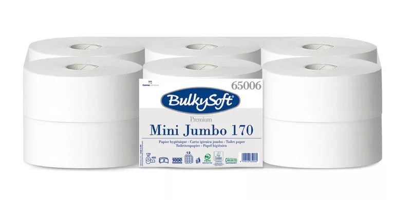 BulkySoft Premium mini Jumbo toalettpapír (wc papír), 20cm, 2 rétegű, hófehér, 485 lapos, 170 méter/tekercs, 12 tekercs/zsák