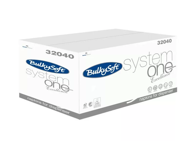 Kiváló minőségű V hajtogatott szalvéta, BulkySoft System One rendszerhez. Hófehér, 100% cellulóz alapanyagból készül. EU Ecolabel és PEFC tanúsítvánnyal rendelkezik.