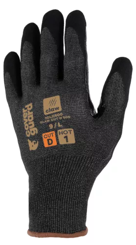 A CLAW CUT termékcsalád egy új generációs vágásálló kesztyű, amelyet azért fejlesztettek ki, hogy megvédjen a legigényesebb munkák során, magas vágásállósági szinttel (CUT D-től A9-ig), és kiváló kényelmet, valamint kivételes ügyességet biztosítson minden munkakörnyezetben (száraz, nedves és olajos).A CLAW CUT D 500 modellt finom anyagmozgatási munkákhoz tervezték száraz és olajos környezetben. A magas 21-es kötés, amely egy rendkívül puha és erős üvegszál, poliészter és spandex alapú anyagból készült, második bőr érzést nyújt, miközben kiváló vágásvédelmet biztosít (CUT D).A tenyér nitrillel bevont, dupla rétegű, szemcsézett / homokszerű felülettel rendelkezik, vízálló, és a hüvelykujj és a mutatóujj közötti hosszú megerősítés kiváló tapadást és jó fogást biztosít a legigényesebb munkák során száraz és olajos környezetben, valamint magas szintű kopásvédelmet nyújt (COVERPERF címke: >20.000 ciklus).A CLAW CUT D 500 újrahasznosított poliészter szálból készült, amely RCS tanúsítvánnyal rendelkezik (a termék teljes súlyának 14%-a). Üvegszál nélkül.Ez a kesztyű érintőképernyő-kompatibilis, így viselése közben is használhatja a képernyős berendezéseket. Sanitized kezelés: megakadályozza a baktériumok és szagok fejlődését, és a CLAW CUT D 500 hypoallergén is (COVER