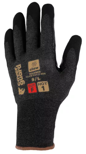 A CLAW CUT termékcsalád egy új generációs vágásálló kesztyű, amelyet arra terveztek, hogy megvédjen a legigényesebb munkák során, magas vágásállósággal (CUT D-től A9-ig), és kiváló komfortot, valamint kivételes ügyességet biztosítson minden munkakörnyezetben (száraz, nedves és olajos).A CLAW CUT F 400 modellt finom anyagmozgatási munkákhoz tervezték száraz és enyhén olajos környezetben. A magas 21-es kötés párosítva egy rendkívül puha és erős üvegszál, poliészter, acél és spandex alapú szálból készült, második bőr érzést nyújt, miközben maximális vágásvédelmet biztosít (CUT F, az EN388 szabvány szerint).A sandy nitril bevonat és a hosszú megerősítés a hüvelykujj és a mutatóujj között kiváló tapadást és jó fogást biztosít. Ez a bevonat nagyon jó légáteresztőséget garantál (COVERPERF címke alatt tesztelve).A CLAW CUT F 400 újrahasznosított poliészter szálból készült, és RCS tanúsítvánnyal rendelkezik (a termék összsúlyának 18%-a). Üvegszál nélkül.Ez a kesztyű érintőképernyős, így viselése közben is használhatja a képernyős eszközöket. Sanitized kezelés: megakadályozza a baktériumok és szagok fejlődését, és a CLAW CUT F 400 hypoallergén is (COVERPERF SKINCARE teszt).