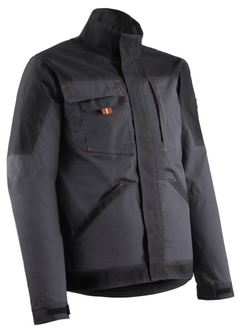 Ripstop: 60% pamut / 40% PES - 280g/m² + poliamid/sztreccs betétek + Oxford 600D - dohány/karamell színben Hosszított hátrész5 zseb Álló gallér Fedett YKK cipzár Tépőzárral állítható mandzsetta Sztreccs zóna hátul vállrésznél Fényvisszaverő díszcsíkok