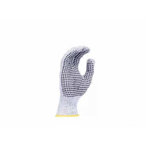 • módosított üvegszálból, spandexből és nylonból kötött, varratmentes védőkesztyű • PVC-vel pontozott tenyér és ujjak • C szintű vágásvédelem