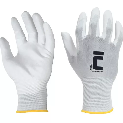 • vékony, lélegző nylon kesztyű PU-ba mártva • 18 GG • érintőképernyő barát