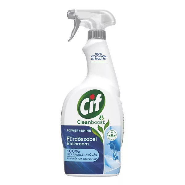 Cif Cleanboost 100% természetes eredetű vízkőoldó hatóanyag, 100% biológiailag lebomló illatanyag, friss és üde illat!Úgy fejlesztjük tisztítószereinket, hogy azok kíméletlenek legyenek a szennyeződésekkel, de kíméljék otthonát és a bolygót. Intsen búcsút a makacs vízkőnek a Cif Cleanboost Univerzális Vízkőoldó spray-vel!Továbbfejlesztett formulánk 100%-os vízkő- és szappanlerakódás mentes felületeket biztosít és könnyedén elbánik a legmakacsabb szennyeződésekkel is.> Bármely otthonunkban előforduló vízköves← felületen alkalmazható! > Szappanlerakódás és vízkőnyom eltávolítás különböző felületekről. > Élelmiszerrel érintkező felületeken is alkalmazható.Használati utasítás:Fújja a felületre, hagyja hatni néhány másodpercig, majd törölje át egy száraz ronggyal. A makacs foltok eltávolításához hagyja hatni néhány percig mielőtt áttörli a felületet. Használja fenntarthatóan. A környezet védelme érdekében használja takarékosan.Összetevők:<5% nem ionos felületaktív anyagok, Illatanyag, Sodium Benzoate.Figyelmeztetés:Ne használja márvány, természetes kő, festett fa, anódkezelt alumínium és linóleum felületeken. Zománcon, festett felületeken, vagy új/szokatlan felületeken való használat előtt, először próbálja ki egy kis, nem feltűnő helyen. Alaposan öblítse le műanyagon, festett fémen és titán zománcos fürdőkádon való használat után. Ez a termék nem ipari takarításra szolgál.Kiszerelés: 750 ml/flakon.Csomagolás: 1 db, gyűjtőcsomagolás: 12 db/karton.