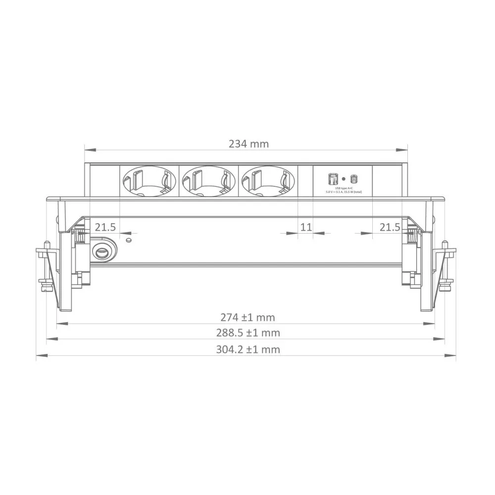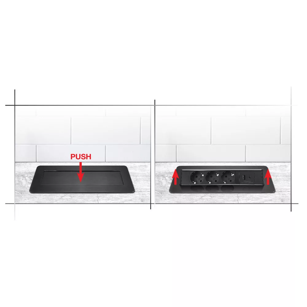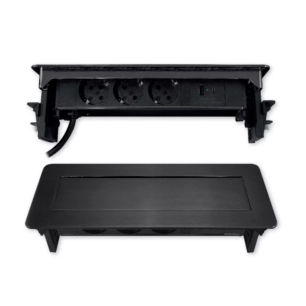 Commel bútorba süllyeszthető, rejtett elosztó 3 db aljzat, USB A+C fekete, 16A 3680W