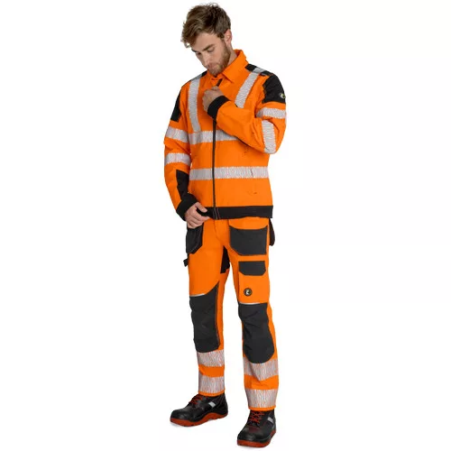 • jólláthatósági (HV) 4 irányban rugalmas poliészter szövet • szegmentált fényvisszaverő csíkok • számos praktikus zseb oldalt és elöl • levehető kapucni • textilerősítés vállrészen