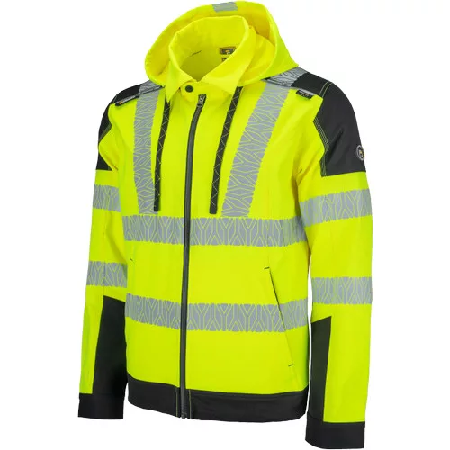 • jólláthatósági (HV) 4 irányban rugalmas poliészter szövet • szegmentált fényvisszaverő csíkok • számos praktikus zseb oldalt és elöl • levehető kapucni • textilerősítés vállrészen