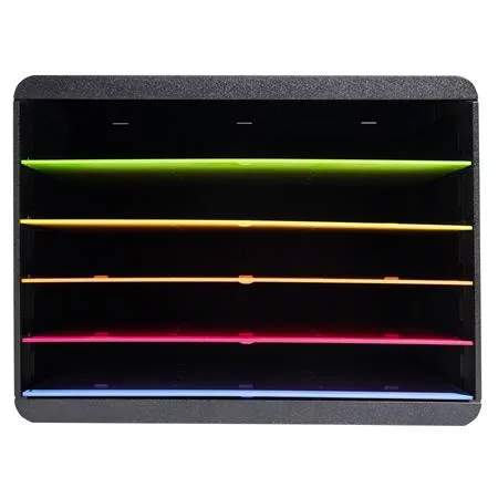 Színes dokumentum szortírozó -méret: 270 x 355 x 271 mm -rekeszek száma: 5 -színe: fekete -formátum: A4+ -alkalmas fekvő tájolású dokumentumok, pl. adatlapok tárolására -anyaga: műanyag -rakásolható -25 év garancia