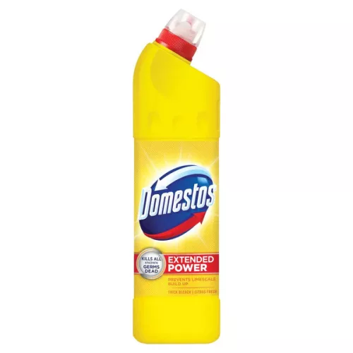 Sokoldalú tisztítószer és hatásos fegyver a kórokozók ellen az egész házban. A Domestos minden ismert kórokozófajt elpusztít és hatékony a baktériumok, gombák, spórák és vírusok ellen. A Domestos Extended Power vízkőlerakódást gátló hatóanyagot tartalmaz. Megtapad a víz szintje alatt is, eltávolítja a koszt és gátolja a vízkő lerakódását. Napi használat esetén a szabadalmaztatott Hygiene Molecules összetevőivel egész napos védelmet biztosít önnek és családjának a WC-ből öblítéskor kiszálló kórokozók ellen. Továbbfejlesztett összetételének köszönhetően még hosszabban tapad meg a WC falán az öblítés után.Használati útmutató:Hígítás nélküli fertőtlenítéshez:- WC kagylók: fecskendezze a WC kagyló pereme alá (kb. 80 ml-t) és hagyja hatni 15 percig. A még jobb hatás és a szennyeződések eltávolítása érdekében hagyja hatni éjszakára.- Konyhai/fürdőszobai lefolyók: a nyílásba öntve fertőtlenít és megszünteti a kellemetlen szagokat. Hagyja hatni 5 percig.- Mosdókagylók/kádak/mosogatók: fecskendezze a lefolyó és túlfolyó nyílásokba, és hagyja hatni 5 percig, majd alaposan öblítse le.Hígítva fertőtlenítéshez:- Nagyobb felületeken (pl. padlók, csempék): 120ml Domestos / 5 liter víz. Hagyja a felületre rászáradni. Ne használja hígítás nélkül a padlón!- Mosogatókendők, szivacsok: oldjon fel 120ml Domestost fél vödör vízben, áztasson 30 percig.Hígítva fehérítéshez:- Adjon 20 ml Domestost 5 liter vízhez, hagyja ázni benne a ruhaneműt egy éjszakán át, majd öblítse ki. Mindig műanyag edényt használjon. Használható szennyvízülepítővel rendelkező házakban is. 1kupak= 15 ml.A fertőtlenítőszert alkalmazza biztonságosan!Összetevők:Fertőtlenítőszer: nátrium-hipoklorit 4,5 g / 100 g <5% klór alapú fehérítőszer/fertőtlenítőszer (nátrium-hipoklorit), nem ionos felületaktív anyagok, szappan, illatanyagHasználat előtt mindig olvassa el a címkét és a használati utasítást! Biocid termékek alkalmazásakor mindig ügyeljen a biztonságra!Kiszerelés: 750 ml.Csomagolás: 1 db, gyűjtőcsomagolás: 20 db.