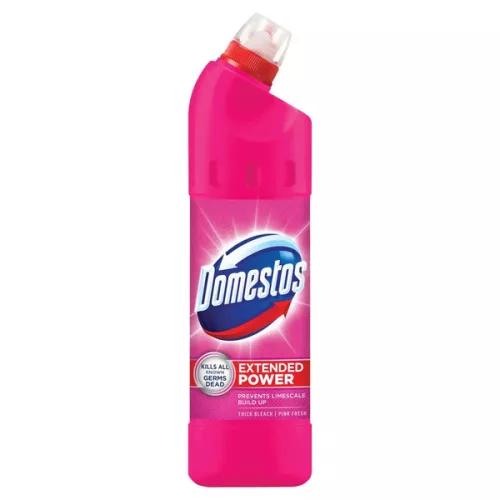 Sokoldalú tisztítószer és hatásos fegyver a kórokozók ellen az egész házban. A Domestos minden ismert kórokozófajt elpusztít és hatékony a baktériumok, gombák, spórák és vírusok ellen. A Domestos Extended Power vízkőlerakódást gátló hatóanyagot tartalmaz. Megtapad a víz szintje alatt is, eltávolítja a koszt és gátolja a vízkő lerakódását. Napi használat esetén a szabadalmaztatott Hygiene Molecules összetevőivel egész napos védelmet biztosít önnek és családjának a WC-ből öblítéskor kiszálló kórokozók ellen. Továbbfejlesztett összetételének köszönhetően még hosszabban tapad meg a WC falán az öblítés után.Használati útmutató:Hígítás nélküli fertőtlenítéshez:- WC kagylók: fecskendezze a WC kagyló pereme alá (kb. 80 ml-t) és hagyja hatni 15 percig. A még jobb hatás és a szennyeződések eltávolítása érdekében hagyja hatni éjszakára.- Konyhai/fürdőszobai lefolyók: a nyílásba öntve fertőtlenít és megszünteti a kellemetlen szagokat. Hagyja hatni 5 percig.- Mosdókagylók/kádak/mosogatók: fecskendezze a lefolyó és túlfolyó nyílásokba, és hagyja hatni 5 percig, majd alaposan öblítse le.Hígítva fertőtlenítéshez:- Nagyobb felületeken (pl. padlók, csempék): 120ml Domestos / 5 liter víz. Hagyja a felületre rászáradni. Ne használja hígítás nélkül a padlón!- Mosogatókendők, szivacsok: oldjon fel 120ml Domestost fél vödör vízben, áztasson 30 percig.Hígítva fehérítéshez:- Adjon 20 ml Domestost 5 liter vízhez, hagyja ázni benne a ruhaneműt egy éjszakán át, majd öblítse ki. Mindig műanyag edényt használjon. Használható szennyvízülepítővel rendelkező házakban is. 1kupak= 15 ml.A fertőtlenítőszert alkalmazza biztonságosan!Összetevők:Fertőtlenítőszer: nátrium-hipoklorit 4,5 g / 100 g <5% klór alapú fehérítőszer/fertőtlenítőszer (nátrium-hipoklorit), nem ionos felületaktív anyagok, szappan, illatanyagHasználat előtt mindig olvassa el a címkét és a használati utasítást! Biocid termékek alkalmazásakor mindig ügyeljen a biztonságra!Kiszerelés: 750 ml.Csomagolás: 1 db, gyűjtőcsomagolás: 20 db.