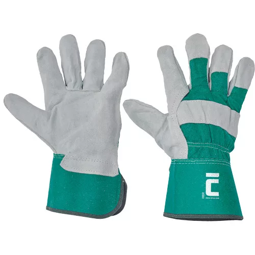 • kombinált védőkesztyű vastag marha hasított bőrből • bélelt tenyér, pamut kézfej, teljesbőr hüvelyk- és mutatóujj, körömvédő